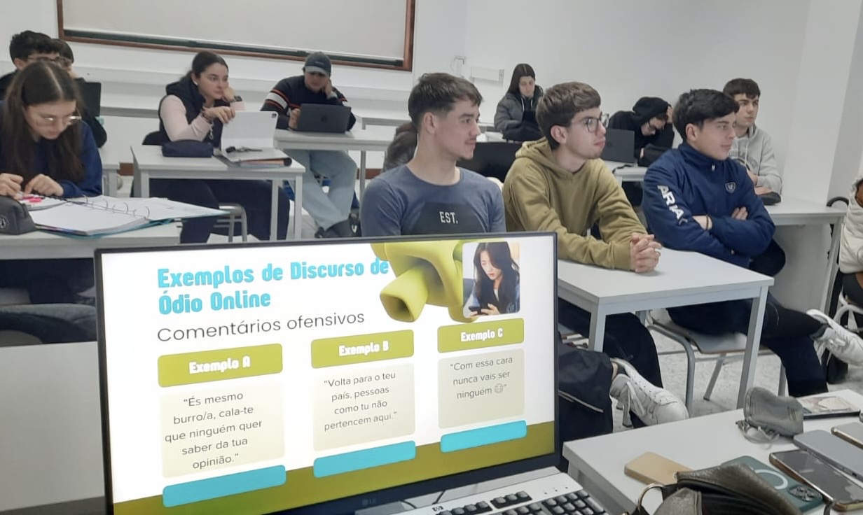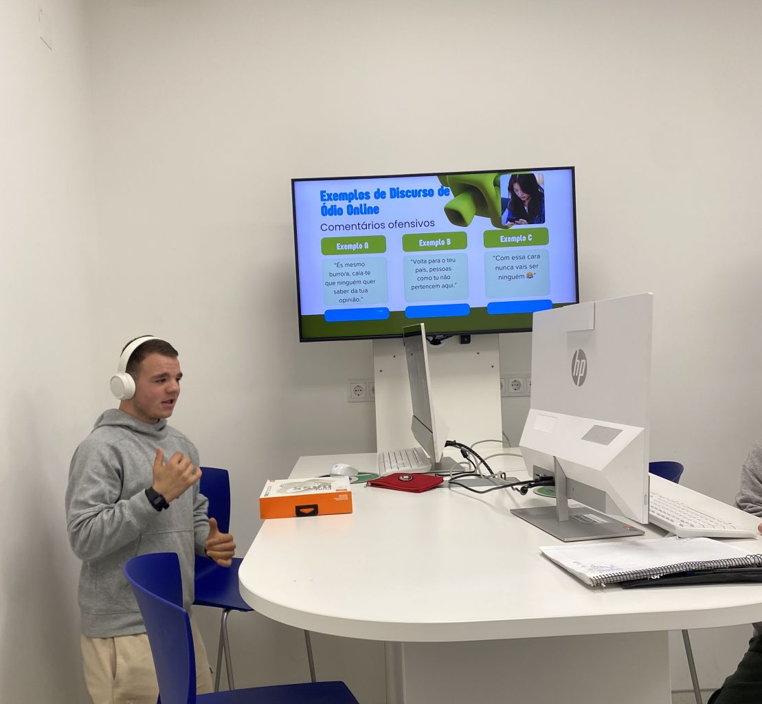 Em aula, os alunos participaram numa atividade de reflexão e discussão sobre o discurso de ódio online, a empatia e a gentileza digital. Foram analisadas situações do quotidiano na Web e debatido o impacto das palavras e atitudes no ambiente digital. Os alunos demonstraram uma postura proativa, reconhecendo a importância de adotar um olhar mais atento e consciente nas interações online.