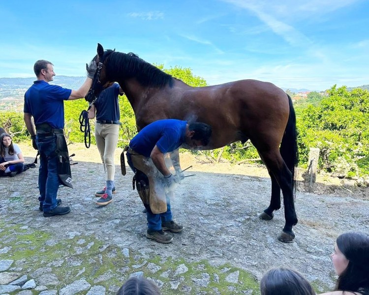 De tarde, além do Dr. Nuno Bernardes, o workshop, com caráter prático, foi também dinamizado pelo ferrador Paulo Vieira. Aqui, os alunos assistiram a um cavalo a ser ferrado a quente, outro a frio, e a trabalhar a ferradura a quente.